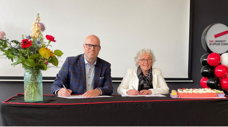 Op de foto Sander Surewaard, Managing Director bij HuRis en Yvonne de Haan RE, Vicevoorzitter College van Bestuur HAN.