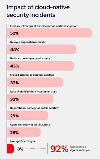 De impact van incidenten gaat verder dan de IT-afdeling. 74% van de organisaties heeft de afgelopen 12 maanden applicatie-implementaties vertraagd of afgeremd wegens securityproblemen. Daarbovenop rapporteerde 92% aanzienlijke gevolgen, waaronder meer tijd kwijt aan herstelwerk (52%), minder productieve ontwikkelaars (43%) en verlies van klantvertrouwen (32%).