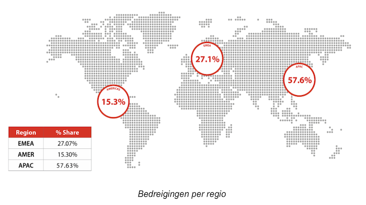 Het aantal malware-detecties daalde in Q2 met 24% dankzij een afname in traditionele detectiemethoden. De stijging van evasive malware – bedreigingen die traditionele handtekening-gebaseerde detectiesystemen omzeilen – nam daarentegen met 168% toe. Deze malware is ontworpen om specifieke securitymechanismen te omzeilen, waardoor het moeilijker wordt om ze op te sporen en te blokkeren. - Opkomst van bedreigingen in de Azië-Pacific regio